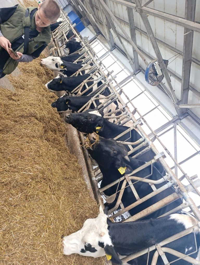 Далее ученики проследовали к коровкам. Здешние буренки родом из Дании. Это пятнистые красотки голштинской породы. Невероятно красивые и ласковые телята дали себя погладить. Место, где содержатся буренки, с трудом можно назвать коровником. Большой выгульный двор с крышей и панорамными окнами.