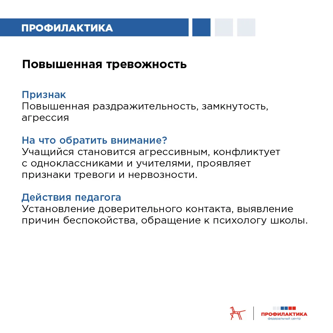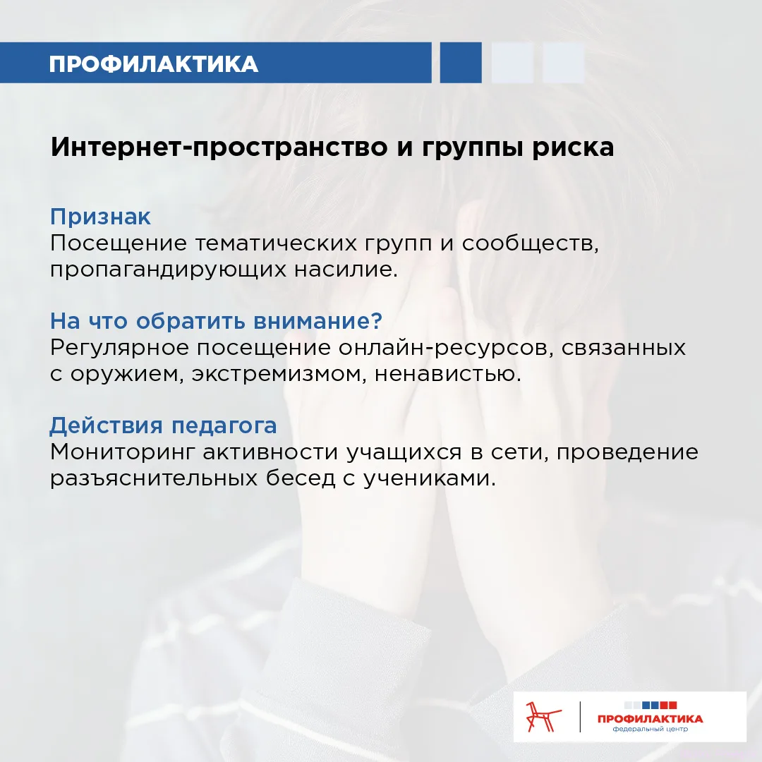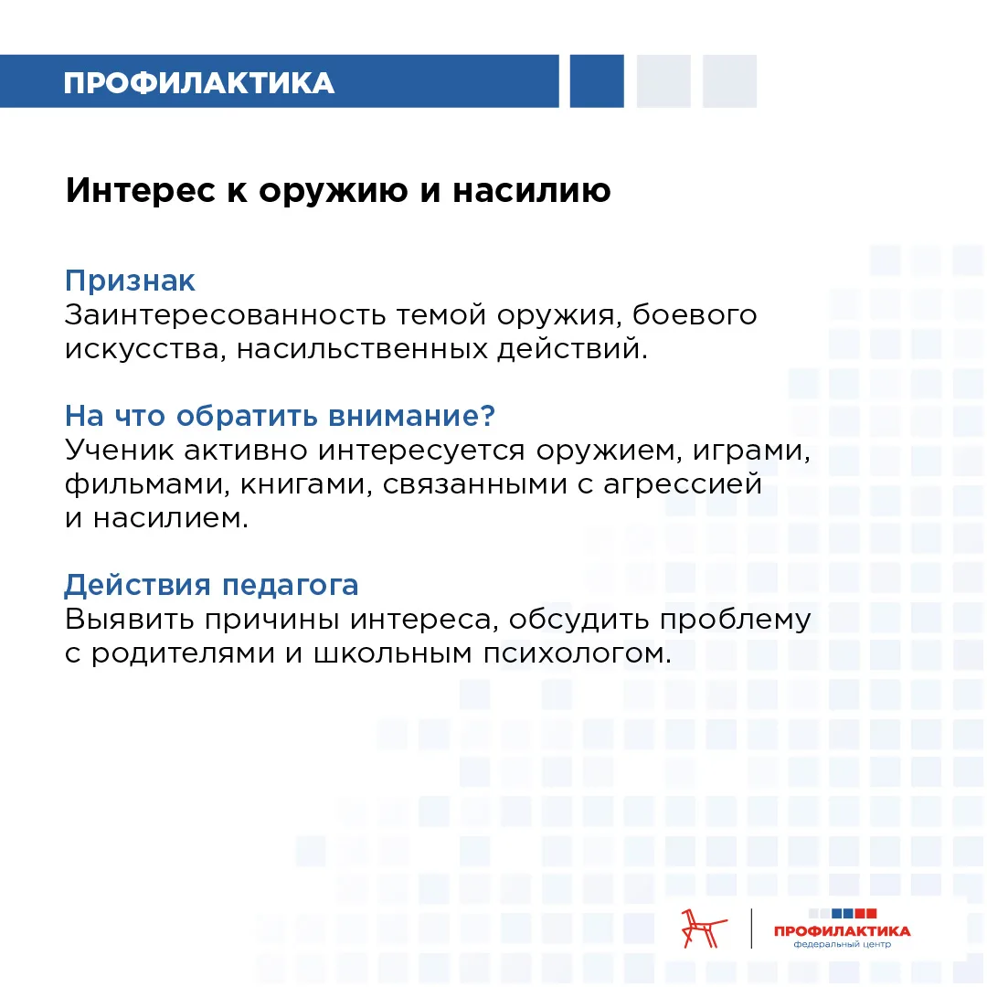 Раннее выявление детей группы риска Безопасность образовательной организации – общая ответственность педагогов, администрации и родителей. Трагедии, связанные с нападениями на школы, подчёркивают: важно вовремя заметить тревожные сигналы и предпринять профилактические меры. Многие агрессивные действия не возникают внезапно, им предшествуют длительные периоды нарастания напряжения, отчуждения, чувства несправедливости. Если заметить «красные флажки» на раннем этапе, можно предотвратить эскалацию конфликта, оказать ребёнку необходимую психологическую помощь, снизить риски для всей школьной среды. Учителя и школьные психологи находятся в уникальной позиции: они ежедневно наблюдают за поведением учеников и могут заметить изменения, которые остаются незамеченными дома. На что именно важно обратить внимание, читайте в карточках