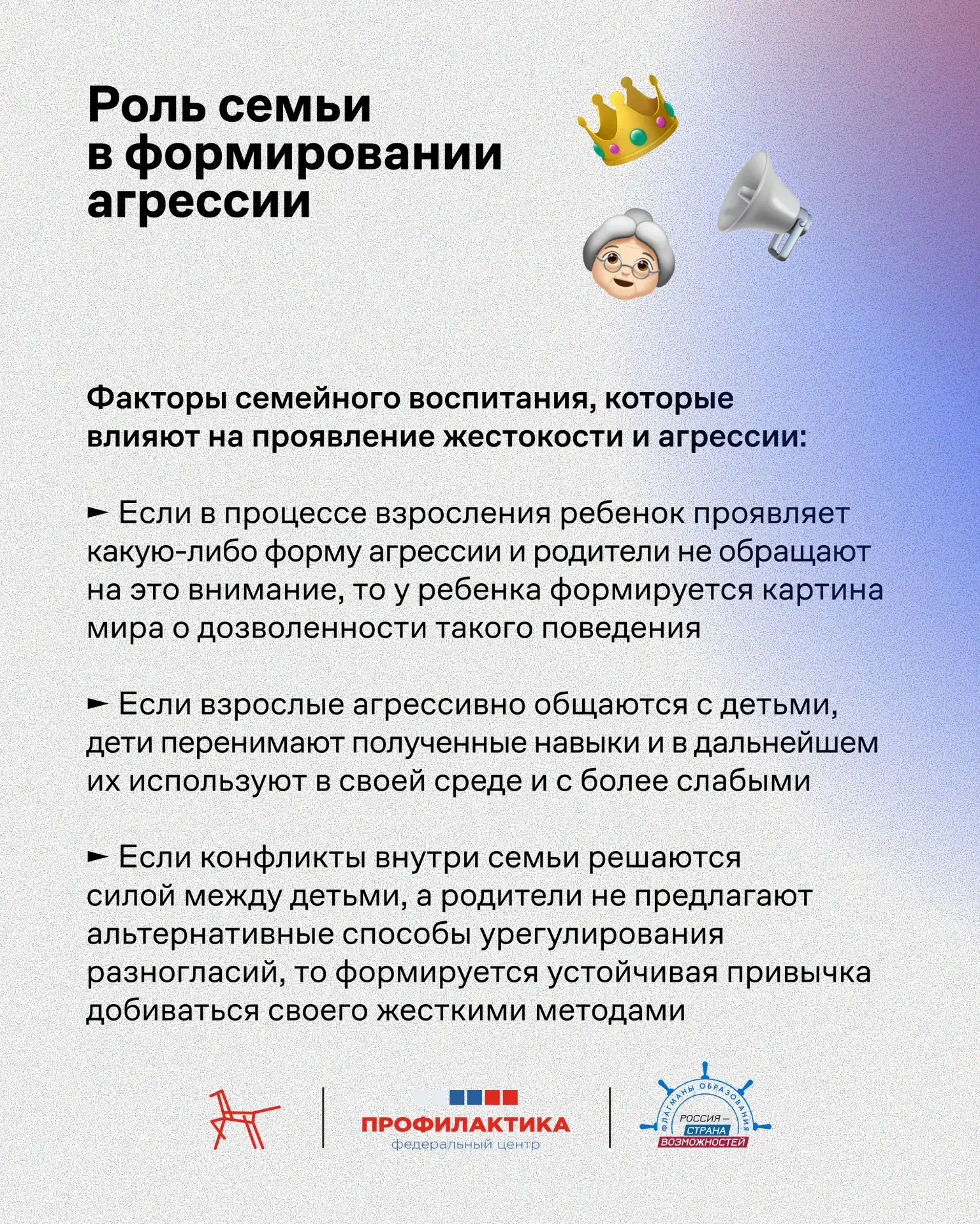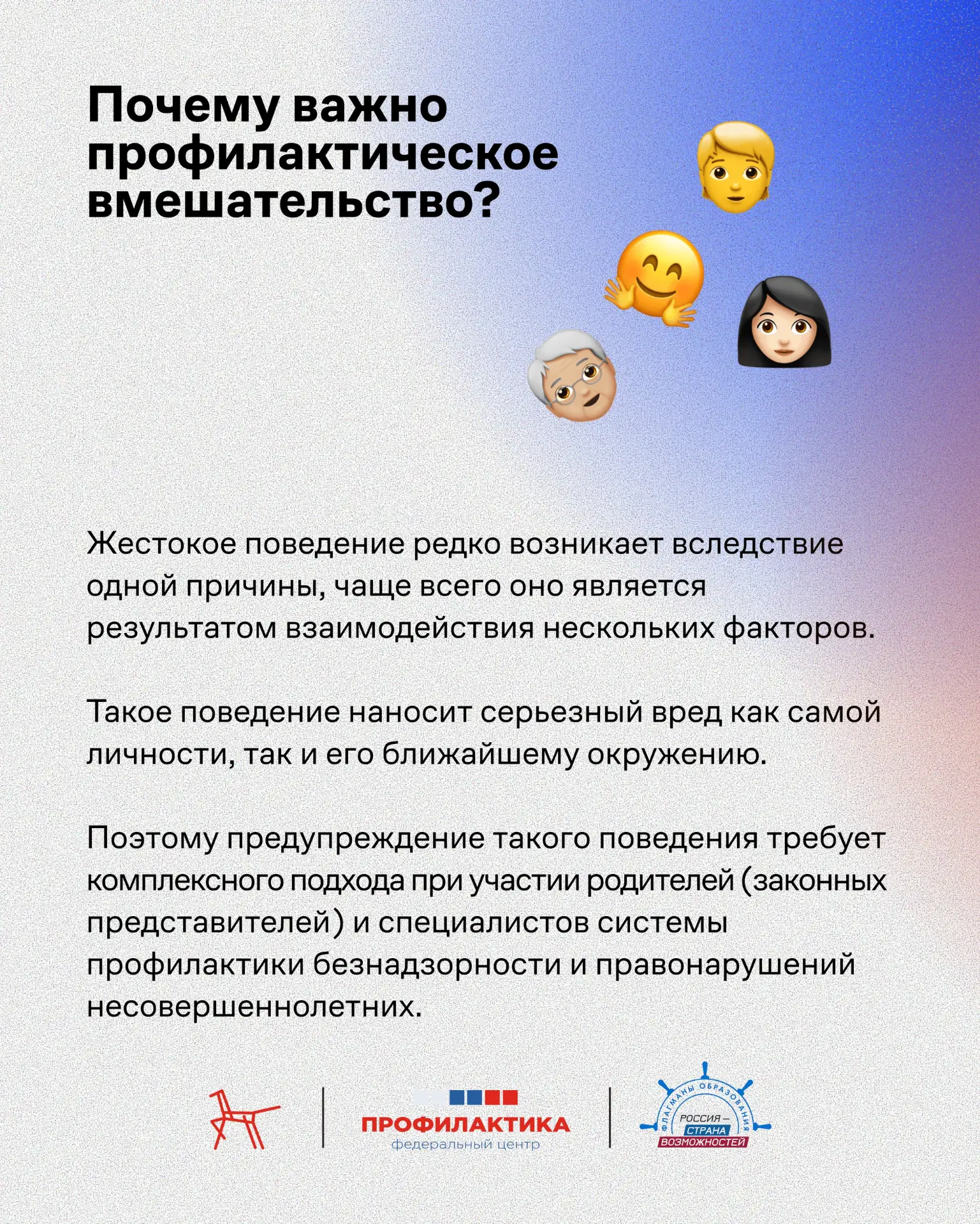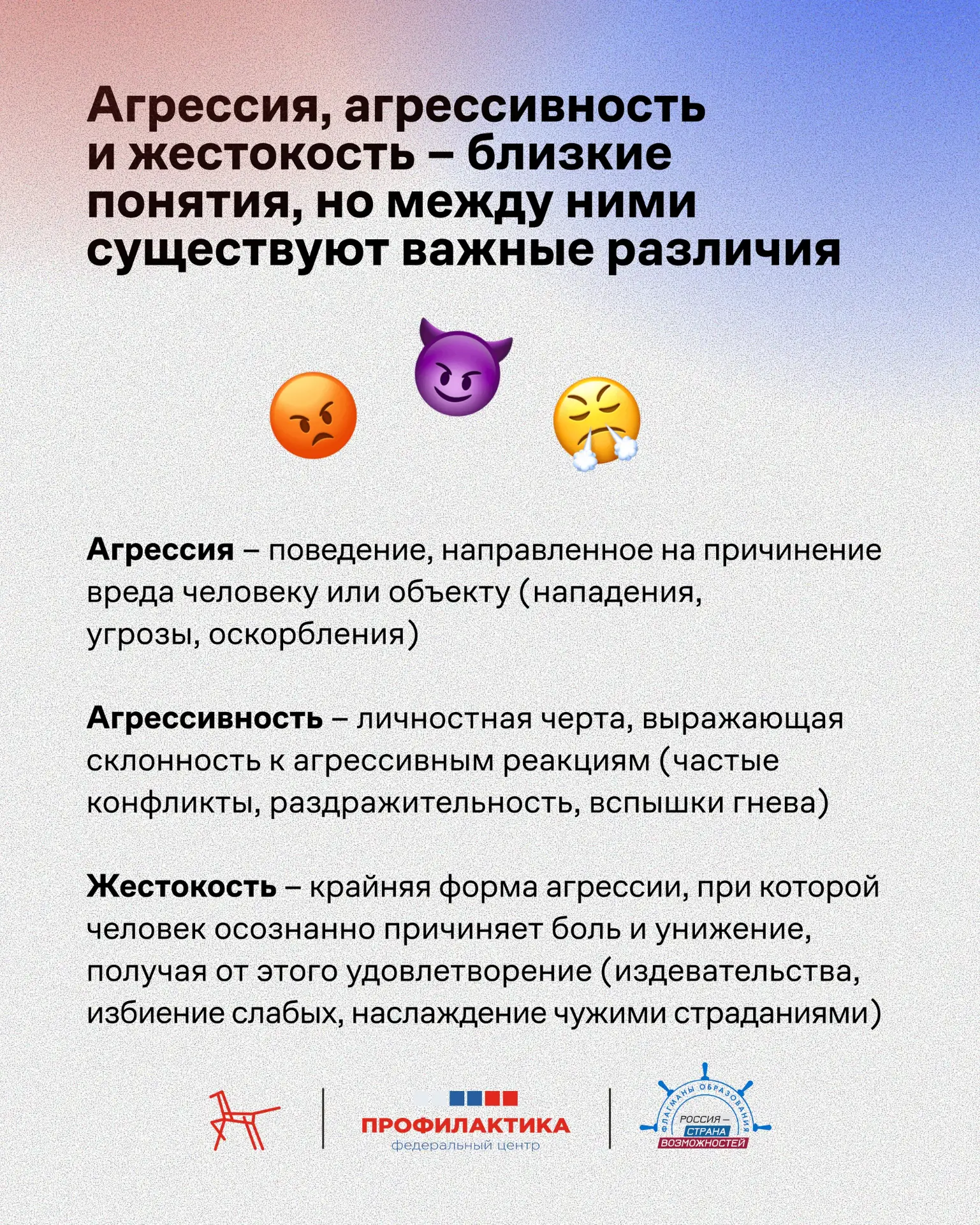 Что посеем в сердце, то и пожнем в поступках: откуда берется детская жестокость? Понимание того, как формируется агрессия у детей и подростков, помогает вовремя заметить проблему и не допустить беды. Федеральный центр «Профилактика» подготовил материал о детской жестокости – в нем разобраны ключевые механизмы ее возникновения и почему профилактика на ранних этапах критически важна для формирования здоровой личности. Также в материале – практические советы для родителей: как выстроить доверительные отношения и на что обратить внимание в поведении ребенка. Читайте и делитесь с коллегами и родителями!