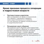 В нашу форму для вопросов экспертам поступило сообщение: Добрый вечер! Дочь 13 лет научилась дерзить, хамить маме, часто повышает голос. На замечания реагирует болезненно, уходит от разговоров, домашние задания проверять не даёт. Говорит: «Моя жизнь — это танцы, подруги и общение в школе. Домой прихожу только ночевать, с вами общаться не хочу». Как вести себя в такой ситуации? Нервы уже сдают. Ответ подготовила психолог Светлана Колесник: «Возраст 13 лет — это начало активного перехода от девочки к девушке, начало активного периода подросткового возраста. Возраста, который имеет такие особенности, как стремление к самостоятельности, повышенное влияние сверстников, колебание настроения, излишняя чувствительность, конфликтность с родителями и другие. Еще одна важная особенность подросткового возраста – интенсивный этап сепарации». О том, как пережить период сепарации, рассказали в карточках