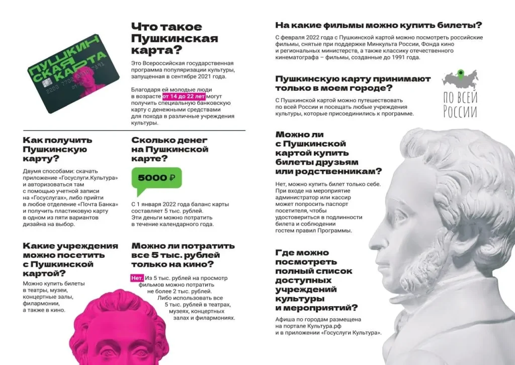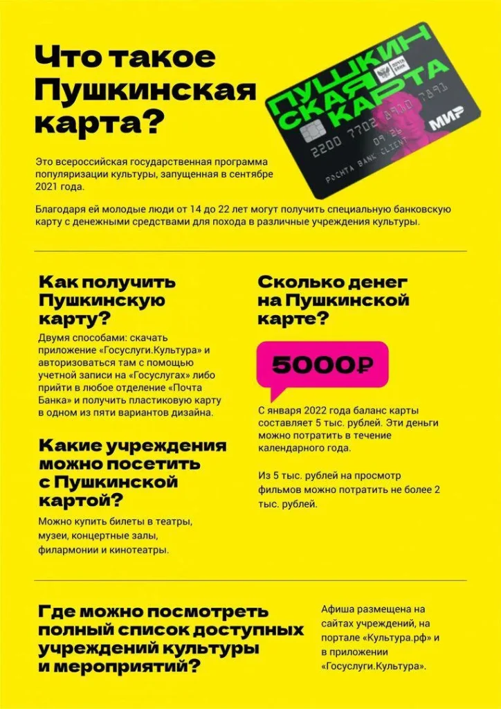 Пушкинская карта. Посещайте театры и кинотеатры, музеи и филармонии за счёт государства Специально для молодёжи. Карту выдают молодым людям от 14 до 22 лет включительно. Билеты оплатит государство. Номинал карты — 5000 ₽, из них 2000 ₽ можно потратить на кино. Большой выбор мероприятий. Театры, музеи, концерты, с 1 февраля доступны билеты в кино.