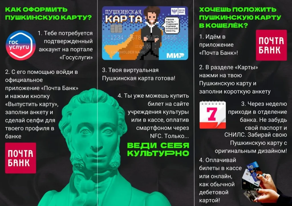 «Пушкинская карта» — совместный проект Минкультуры, Минцифры и Почта Банка. Он позволяет молодым людям бесплатно посещать участвующие в программе театры, кинотеатры, музеи, выставки, филармонии и другие учреждения культуры за счёт федерального бюджета.